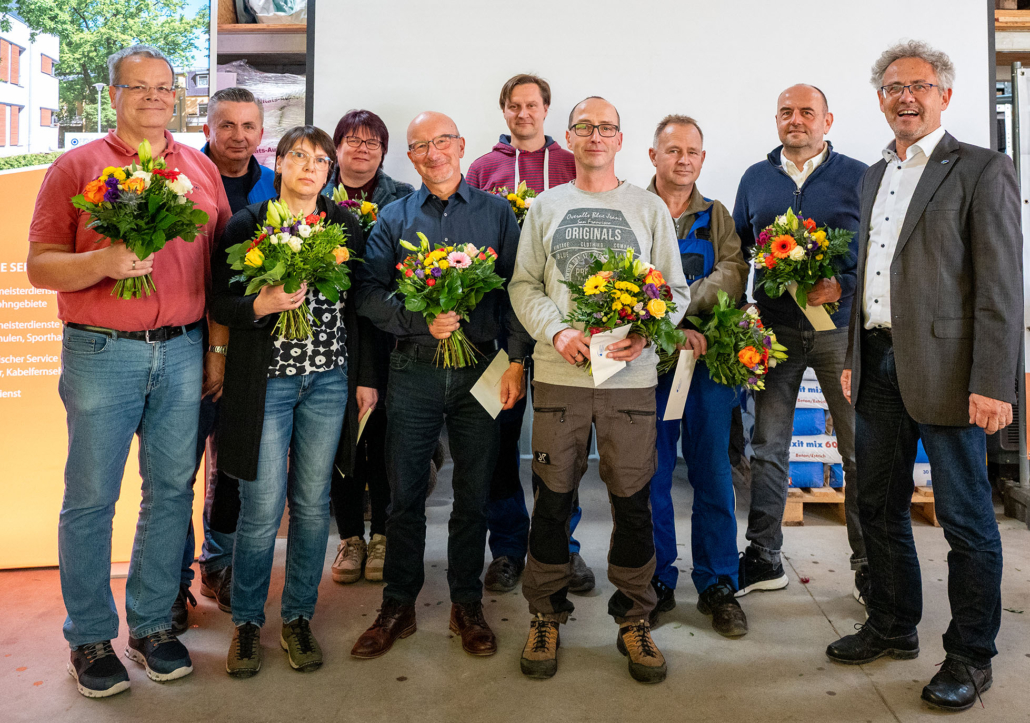 Vor über 25 Jahren fiel der Startschuss für die Gründung der Immobilienservice Weimar GmbH, die eine hundertprozentige Tochter der Weimarer Wohnstätte GmbH ist. Der Wunsch nach einem wirtschaftlich arbeitenden und flexibel agierenden Partner, der den Wohnungs- und Immobilienbestand professionell betreut, reicht bis zum Ende der 1990er Jahre zurück. Was im Jahr 2000 mit einigen wenigen Mitarbeitern begann, hat sich zu einem 70 Mann- und Frau-starken Unternehmen entwickelt. Deshalb sind heute zur Übergabe der IHK-Ehrenurkunde auch viele Mitarbeiter und Mitarbeiterinnen der „ersten Stunde“ anwesend. „Uns war es wichtig, auch diejenigen einzuladen, die den Immobilienservice mit aufgebaut und so den Grundstein dafür gelegt haben, was wir heute sind.“, sagt Geschäftsführer Udo Carstens. Er blickt auf die Anfänge zurück und nennt die wesentlichen Meilensteine der Unternehmensgeschichte. „Sie können zurecht stolz sein auf das, was Sie in den letzten 25 Jahren erreicht haben und ich bedanke mich ausdrücklich bei Ihnen allen, dass Sie unsere kommunalen Immobilien so gut in Schuss halten!“, gratuliert Oberbürgermeister und Aufsichtsratsvorsitzender Peter Kleine anerkennend. „Für uns gehören solche feierlichen Anlässe immer wieder zu den schönen Momenten unseres Amtes, da sie ein positives Signal aussenden und anderen Unternehmen in den schwierigen Zeiten Mut machen“ erklären Annette Projahn, Vorsitzende des Wirtschaftsbeirates Weimar/Weimarer Land, und Markus Heyn, Leiter des IHK-Regionalbüros Weimar. Sie sind heute zum Betriebshof in den Weimarer Norden gekommen, um die Ehrenurkunde persönlich zu überreichen.