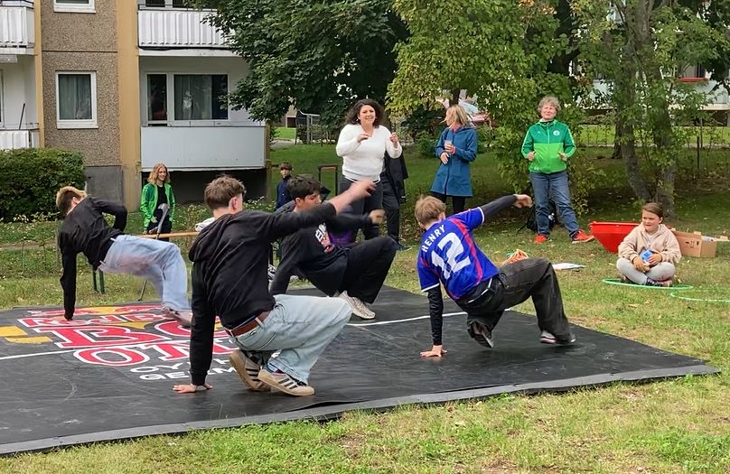 Dies nahm unser Team in Weimar-West zum Anlass, ein gemeinsames Fest auszurichten und die Mieter am Nachmittag des 17. September 2025 einzuladen. Das Programm gestaltete sich vielseitig: Neben der Bastelstraße mit Angeboten vom Sozialraumteam und vom Kinder- und Jugendclub Kramixxo & Waggong lockte die Hüpfburg die jüngeren Mieter an. Für Unterhaltung und ulkige Momente sorgte das „Team Spassimo“ mit den Clowns Kayus & Stevus. Besonders beeindruckend war die Vorführung der Breakdance-Gruppe vom WE-DANCE e.V. Auch der HSV Weimar e.V. regte mit Akrobatik und entsprechenden Turngeräten zum Mitmachen an. Das leibliche Wohl kam natürlich auch nicht zu kurz. Gleich neben dem Getränkestand wirbelte das Team vom Mehrgenerationenhaus am Grill und servierte den Gästen unter anderem eine frische Thüringer Rostbratwurst.